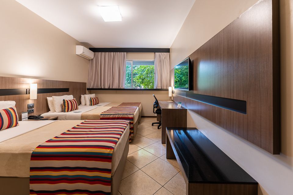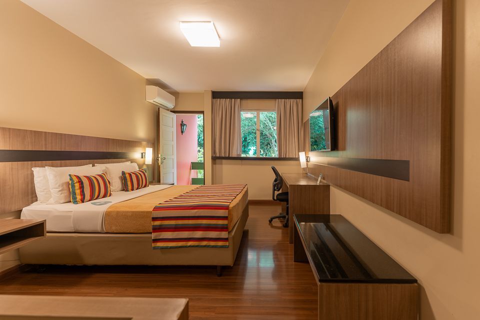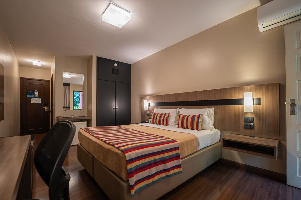 Dispõe de itens como TV Led de 32” com programação completa de canais, minibar, telefone, ar-condicionado split, mesa de trabalho, guarda-roupas.