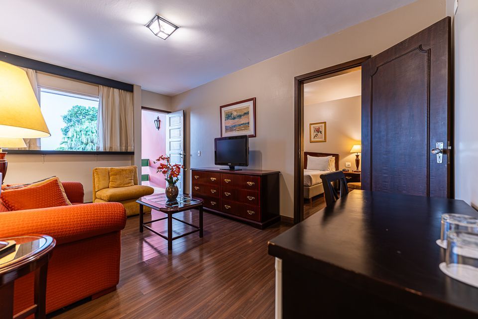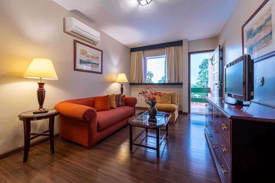 Dispõe de itens como TV Led de 32” com programação completa de canais, sofá, mesa de trabalho, minibar, telefone, ar-condicionado, guarda-roupas.